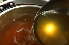 鰹節の旨みは主にイノシン酸で、全身の細胞を活性化させる重要な栄養素。築地・秋山商店、大橋商店さんと相談して決定、その鰹節でとったのが今の鰹だし。琥珀色の鰹だしは少しのお塩で美味しいお吸い物にもなります。